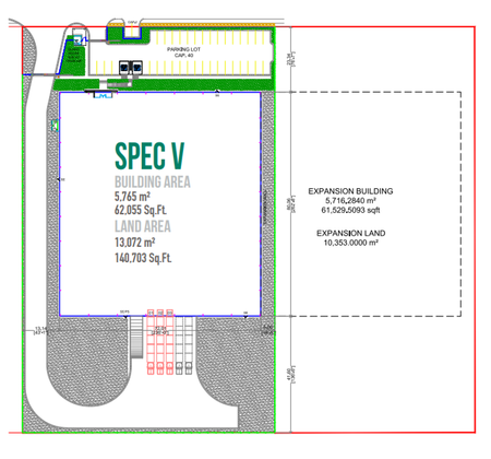 de construcción de 5,765 m2 ( 62,055 Sq.Ft.) y se puede expandir hasta 15,564 m2 (167,534 Sq.Ft.)